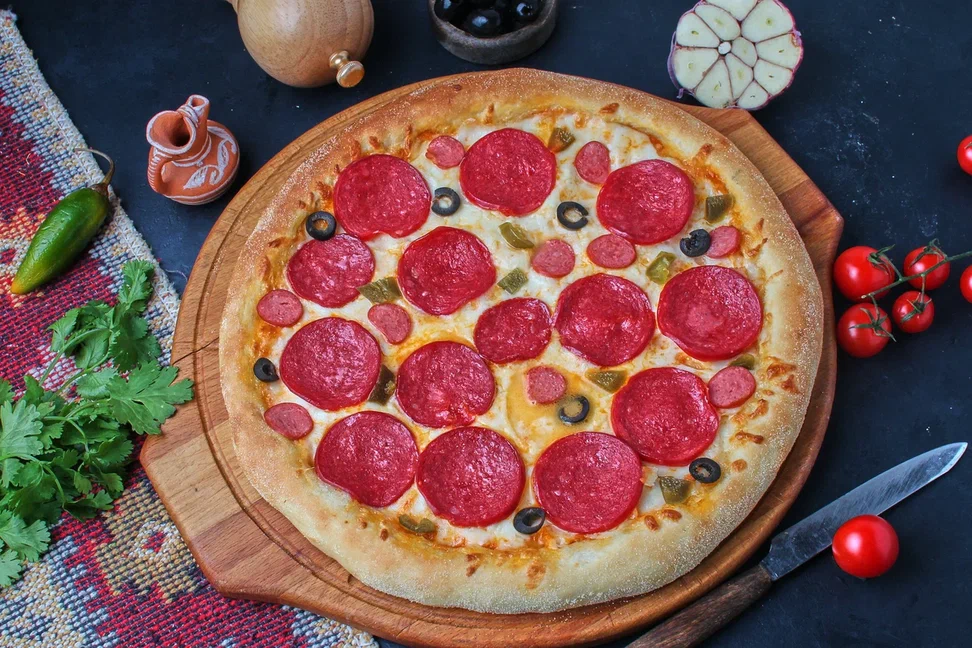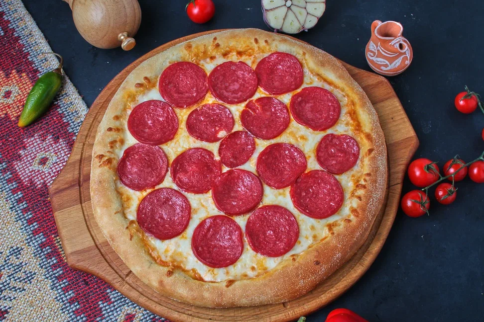 Колбаса, сосиски охотничьи, соус, сыр, острый перец